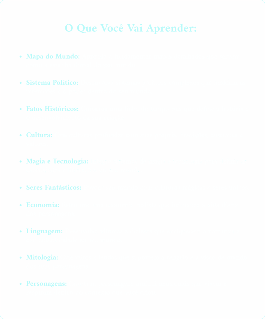 A realidade é que, para criar um mundo de fantasia autêntico e coeso, você precisa de mais do que inspiração. É preciso ter uma estrutura clara, um caminho para construir cada camada do universo de forma lógica e fascinante.